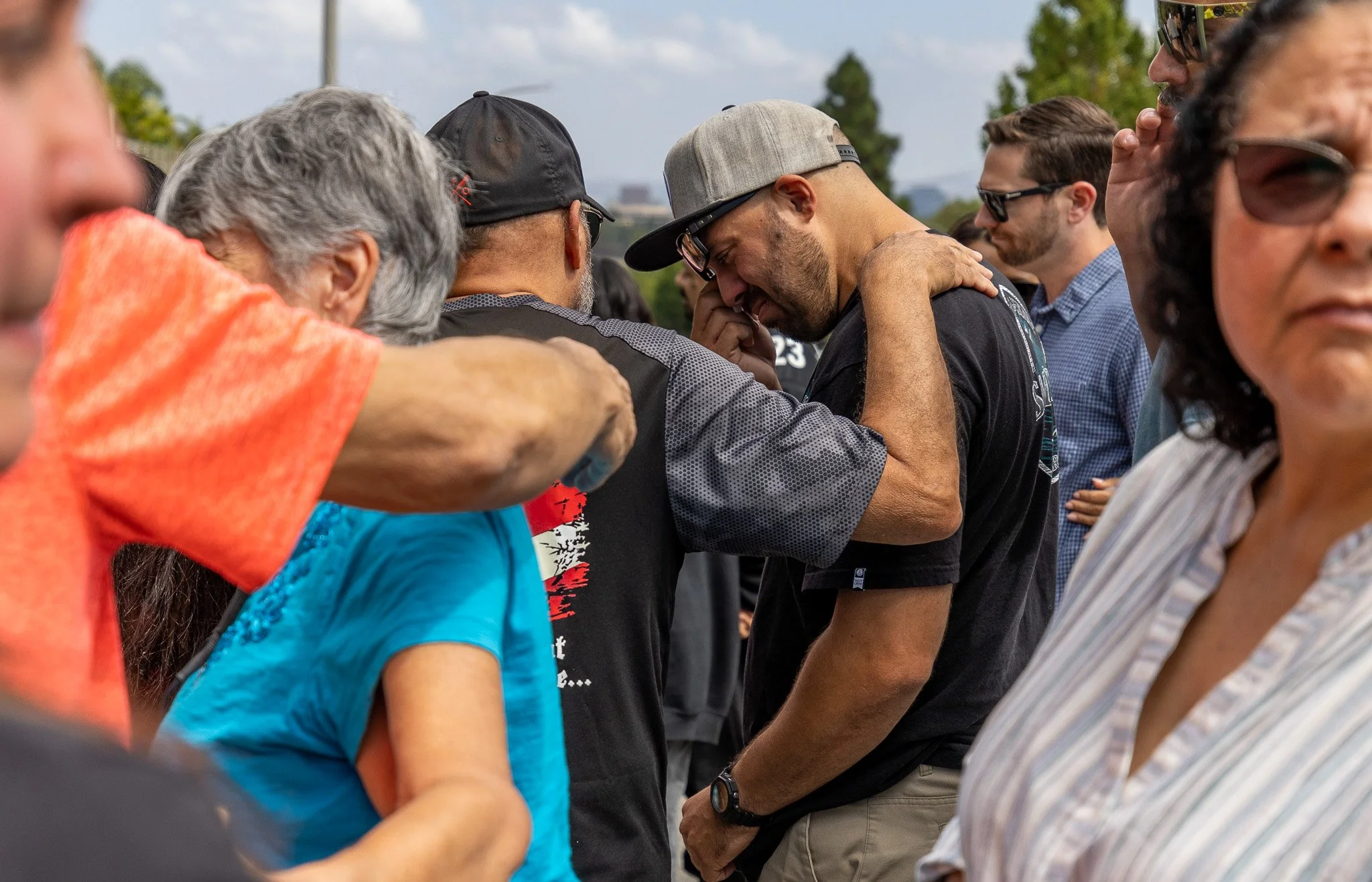 Richard Cintron, brother of Randy Cintron, cyclist struck by a vehicle along Jamboree Road, receives comfort from family and friends at the site of the ghost bike memorial in Newport Beach.