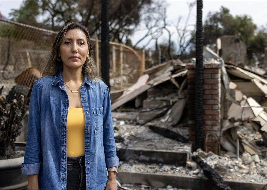 ylvia Zamora stands in the ruins of her home in Altadena. For De Los/LA Times story: Latinos often struggle to keep their footing in the middle class. The fires made it even harder for these families