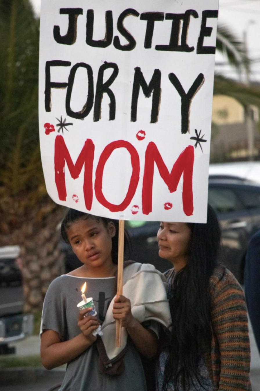 Laura Som comforts Sena Khim's daughter Sovin Nak, 12, as she begins to tear up during a moment of silence at her slain mother's candlelight vigil.