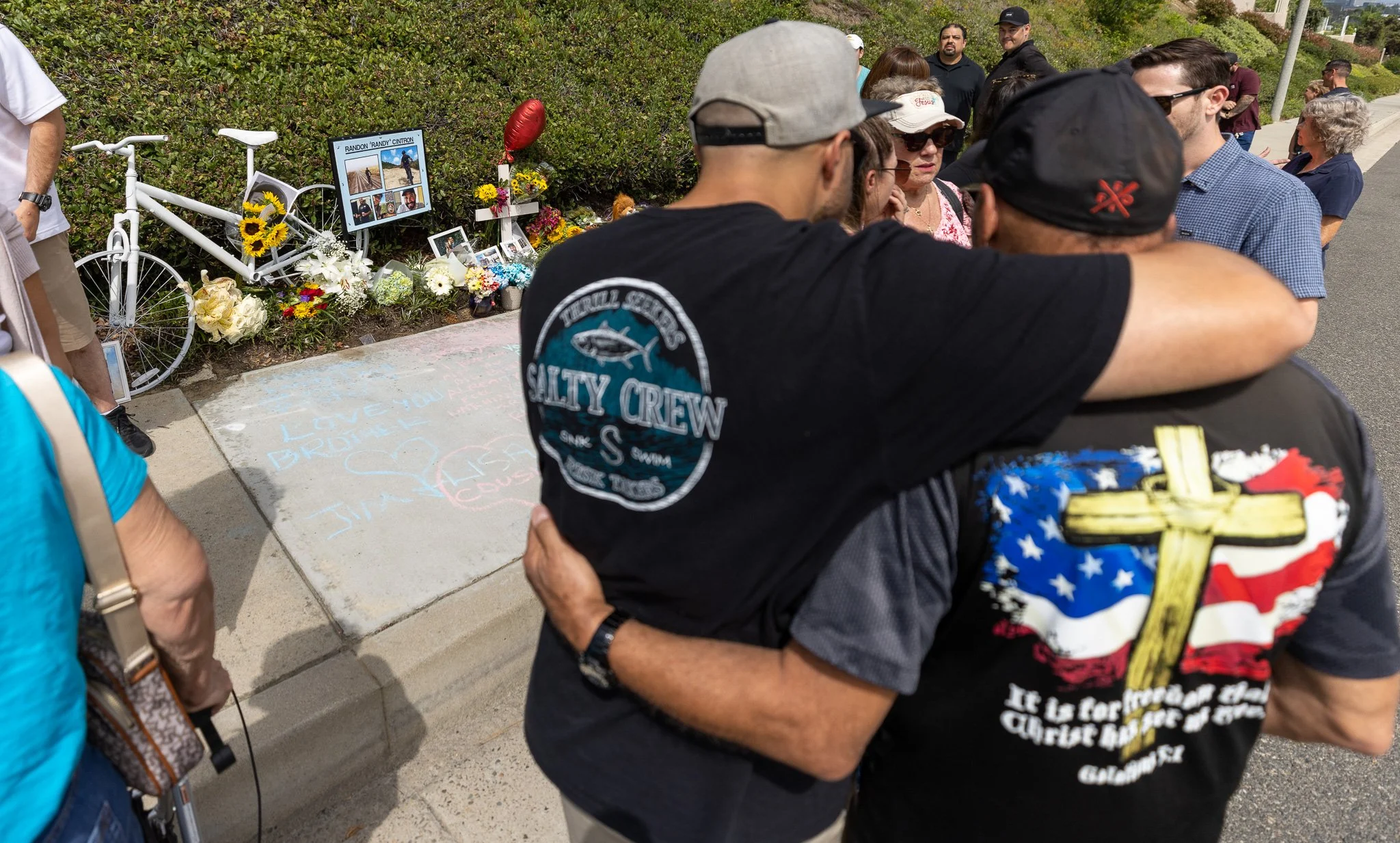 Richard Cintron, brother of Randy Cintron, a cyclist struck by a vehicle along Jamboree Road, receives comfort from his father, William Cintron at the site of Cintron's ghost bike memorial in Newport Beach.