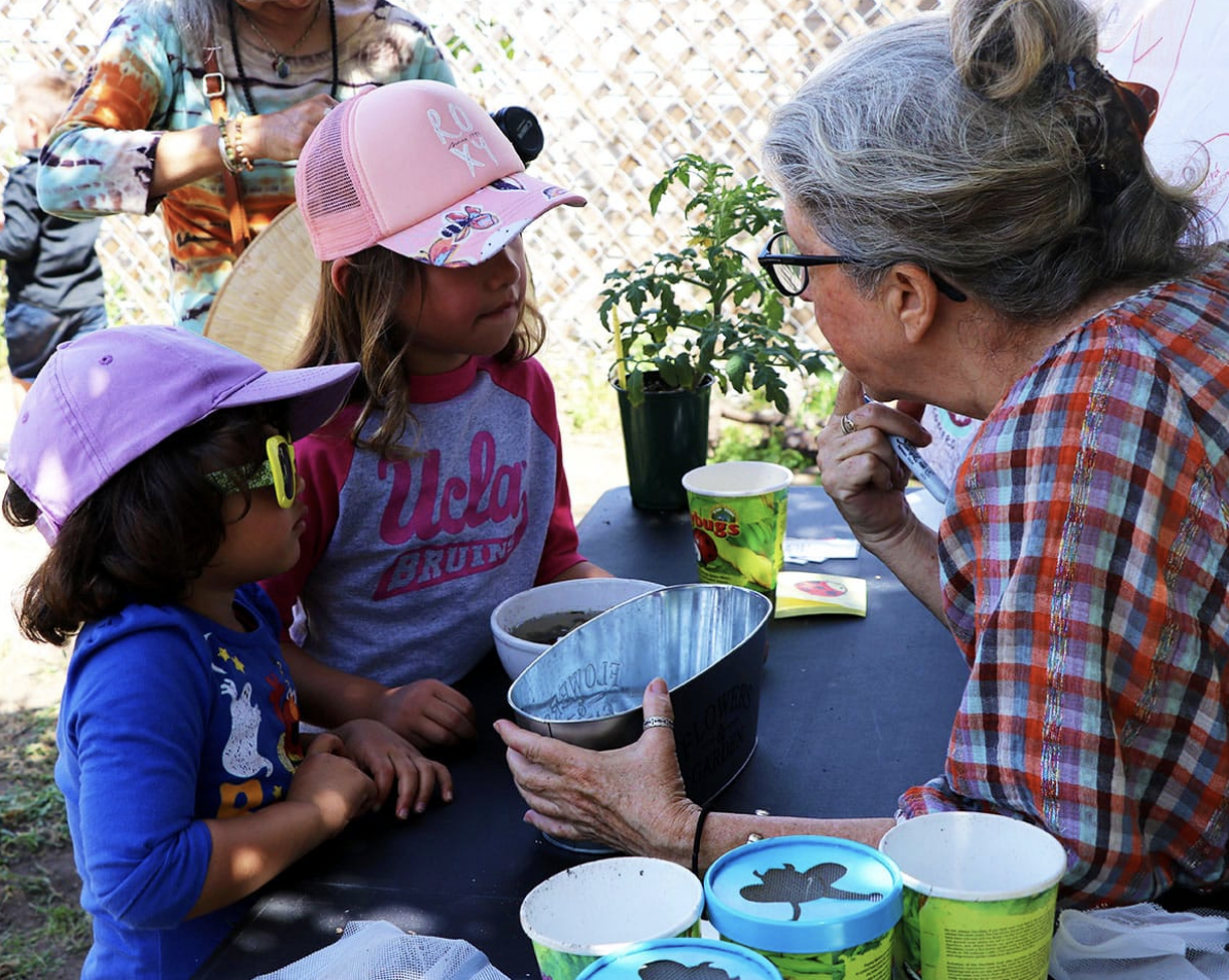 Children learn about the French snails that will eat the brown garden snails at Gladys Avenue Urban Farm.