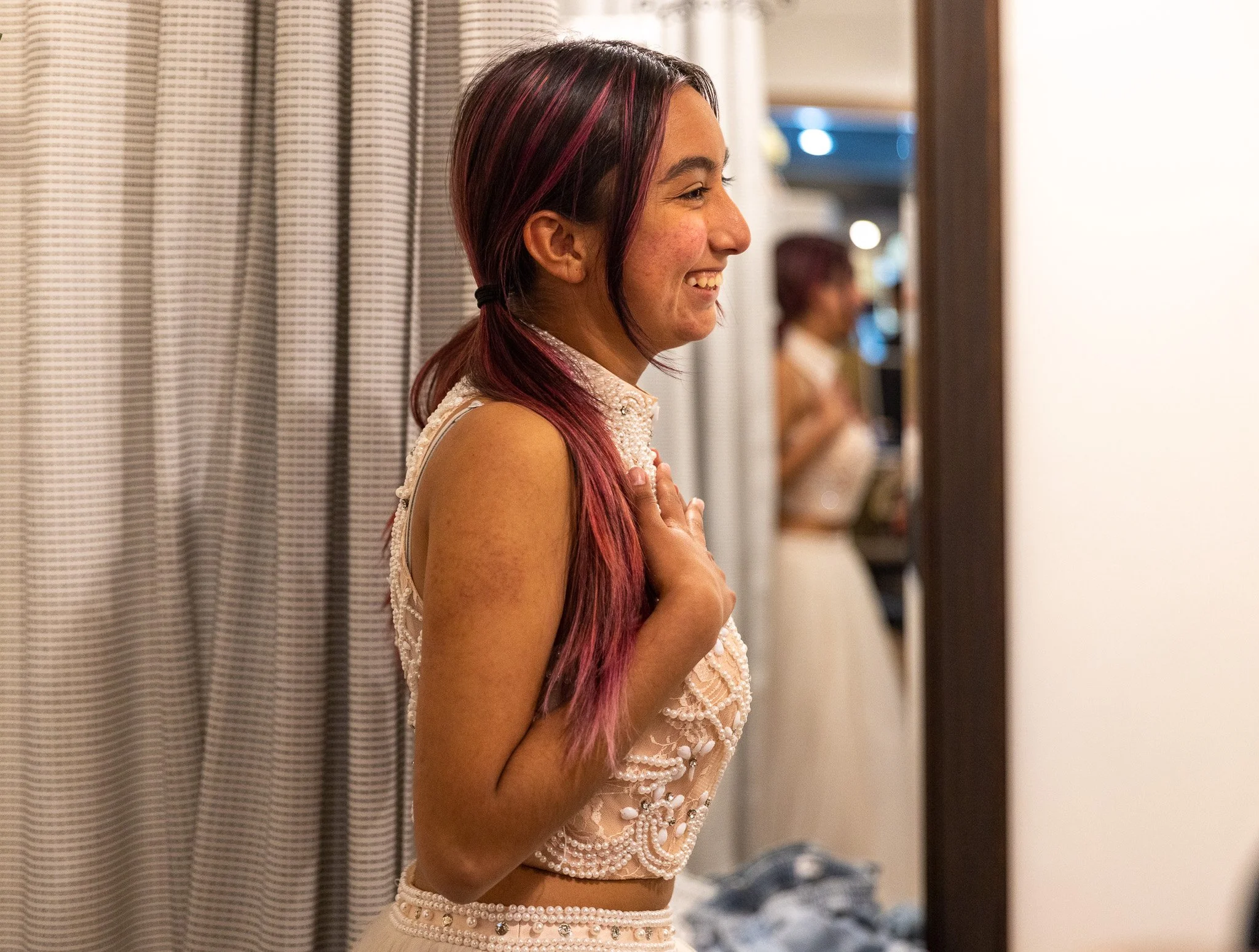 Cassandra Garcia, from Poly High School, receives excited reactions from her friends as she walks out of the dressing room in her new prom dress donated at the Free Prom Pop-Up Shop at AndyLiz Boutique in Long Beach