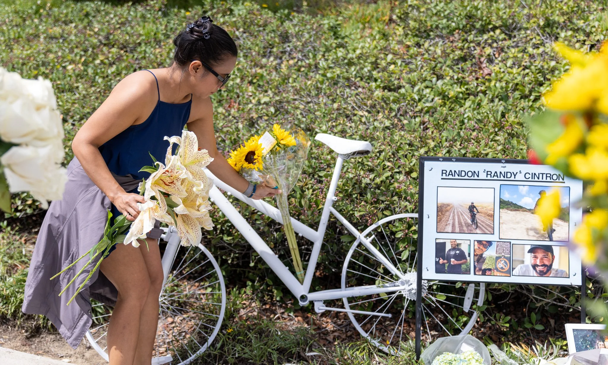 Elaine Canino places flowers on a ghost bike memorializing Randy Cintron on Jamboree Road, where he was struck and killed in a hit-and-run crash in Newport Beach.