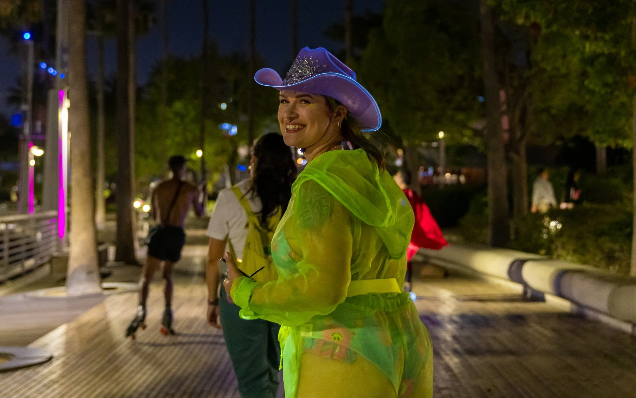Cody Danger smiles while looking back at fellow roller skaters to see how they are faring skating over cobblestones during the Glow Roll on Saturday, June 25, 2022.