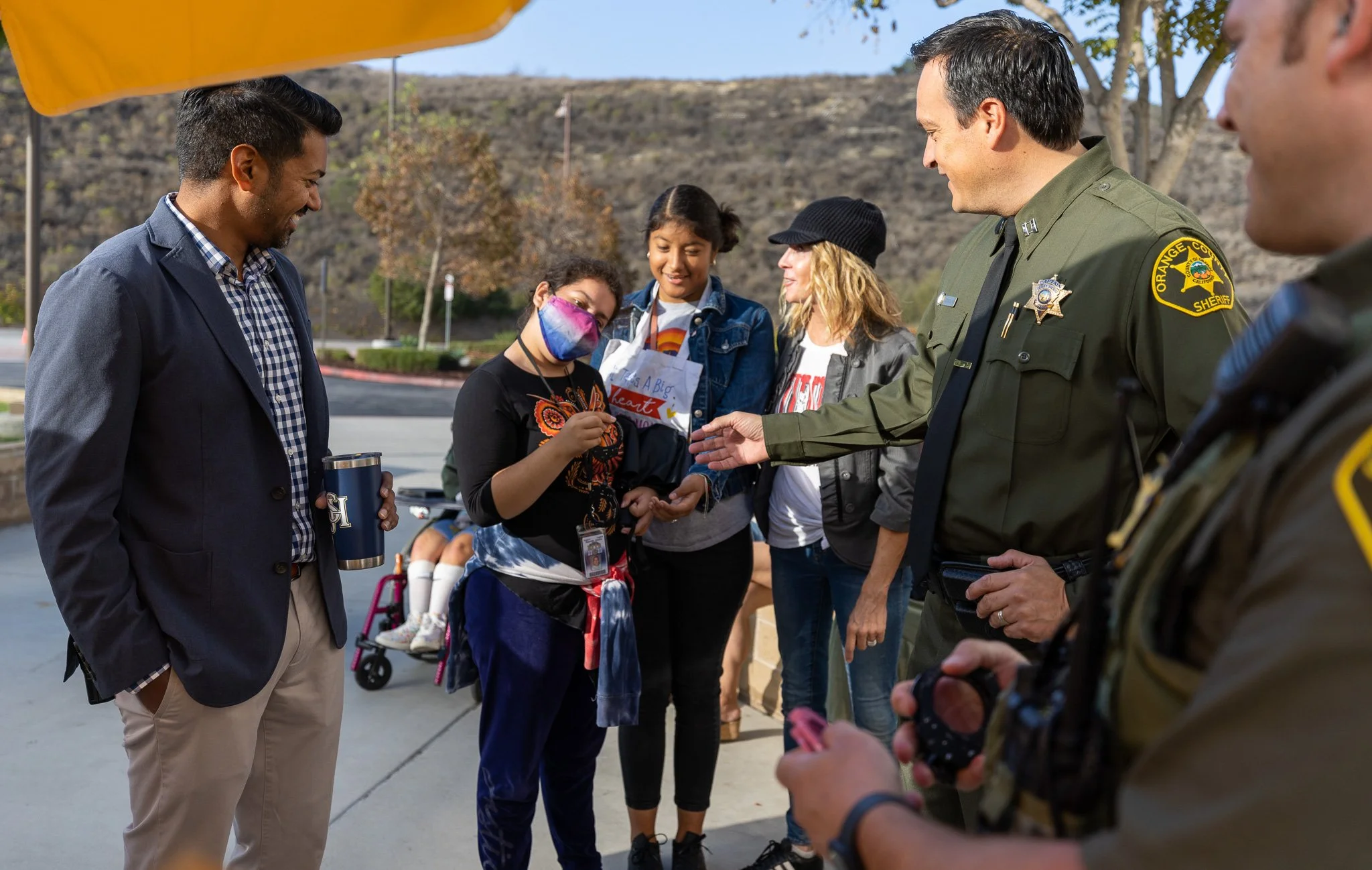 Students at San Juan Hills High School hold Orange County Sheriff’s Department Captain Justin Montano's handcuffs as he participates in the Principal for a Day program.