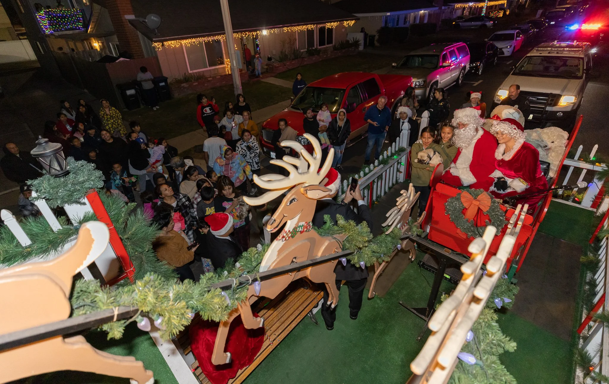 Residents line up on the sidewalk to take a photo with Santa and Mrs. Claus on the Tustin Police Department’s Santa Sleigh.