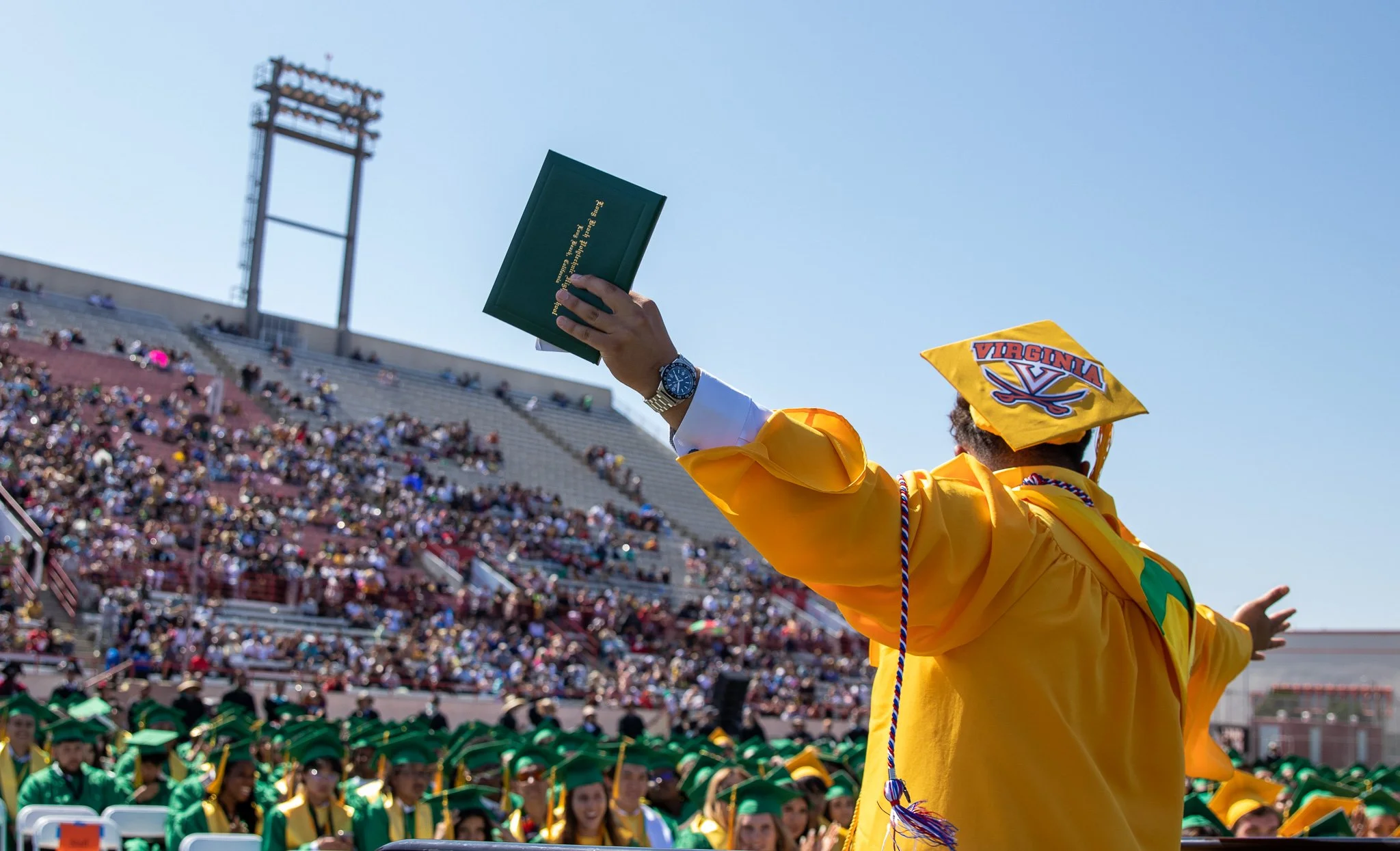Grant Atwood makes his way down the stage to celebrate with fellow graduates at Veterans Stadium in Long Beach, Tuesday June 14, 2022
