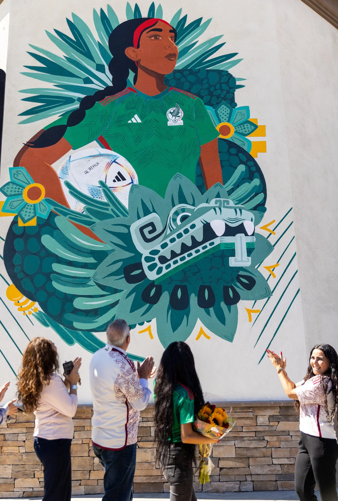 Marlene Solorio devela un mural en la ciudad de Bell con la imagen de una joven indígena vestida con la camiseta del Tri.