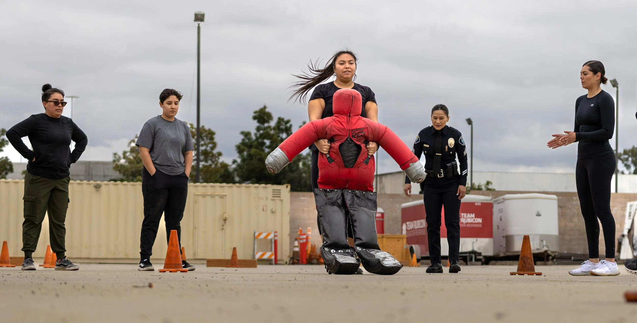 Santa Ana Police Officer Natalie Garcia, far right, and Sgt. Maria Lopez cheer as a participant completes the 165-pound dummy drag during the Santa Ana Police Department’s Female Training Class in Centennial Park on Saturday, March 4, 2023.