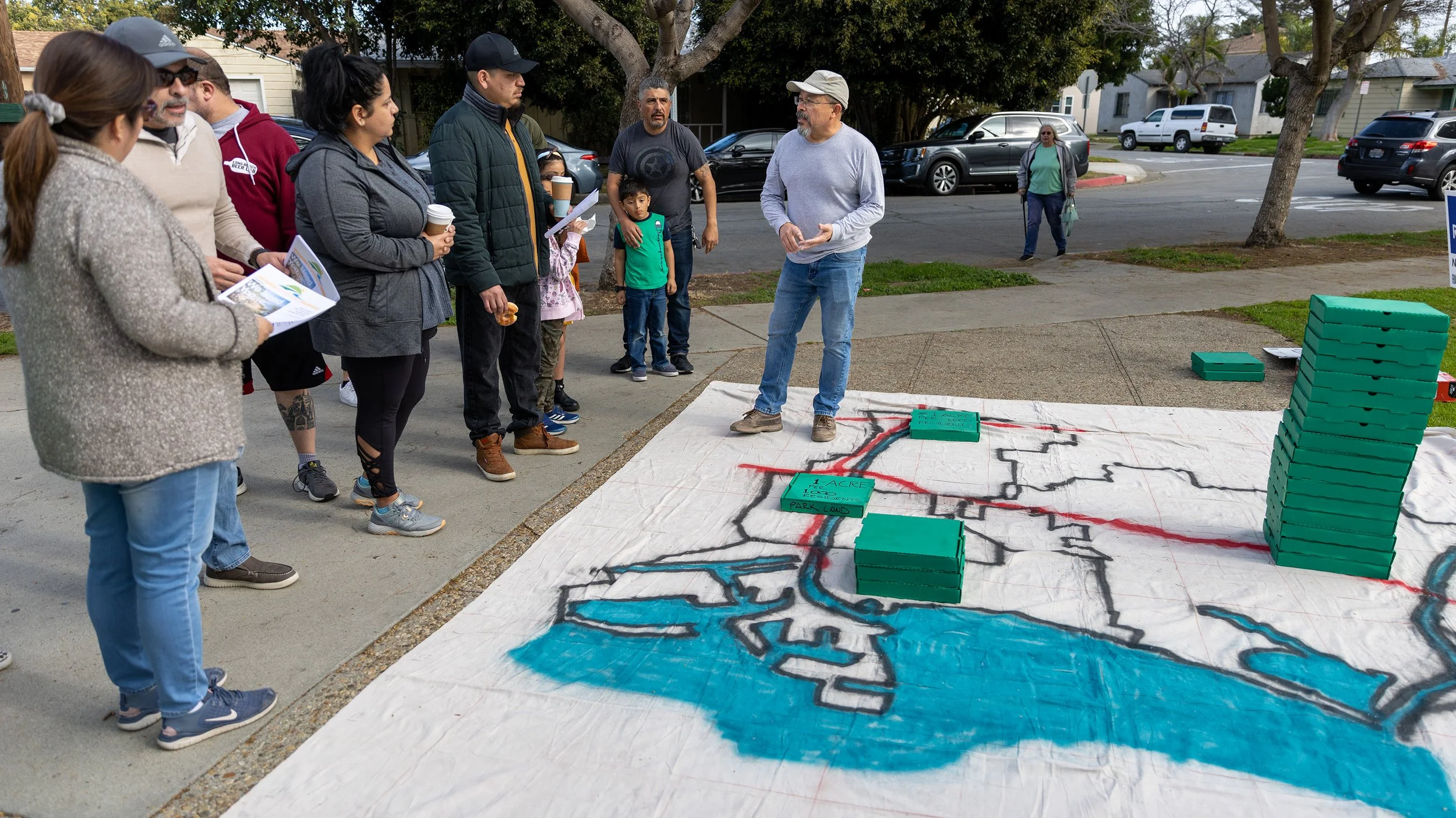 Carlos Ovalle, far right, explains the impact access to green spaces has on communities in Long Beach with the help of a map at Silverado Park. The stacks are representative of life spans, he says. Residents have gathered to protest a plan to utilize the Silverado Park Gymnasium as an Emergency Homeless Shelter on Feb. 11, 2023.