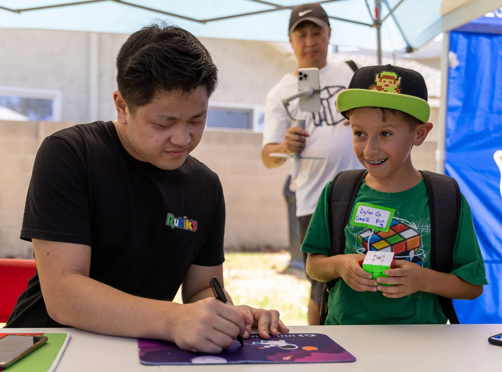 Dylan Garcia looks at his parents while Max Park, the greatest Cuber in the world, signs his autograph at “Day of the Cube" in Fountain Valley.
