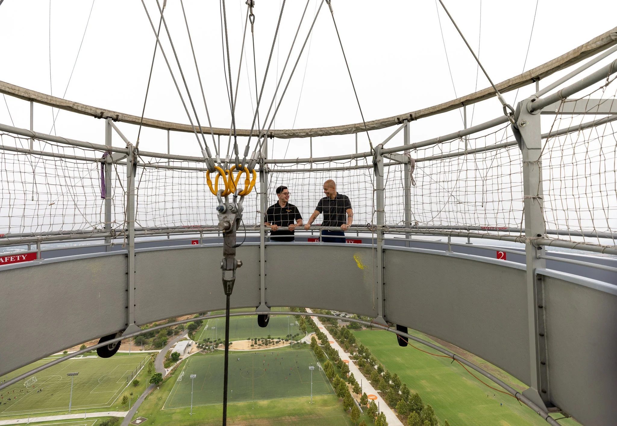 Cancer survivors, Julien Castaneda, 21, and Will Godoy, 43, share details of their cancer journey while riding in the Great Park Balloon in Irvine.