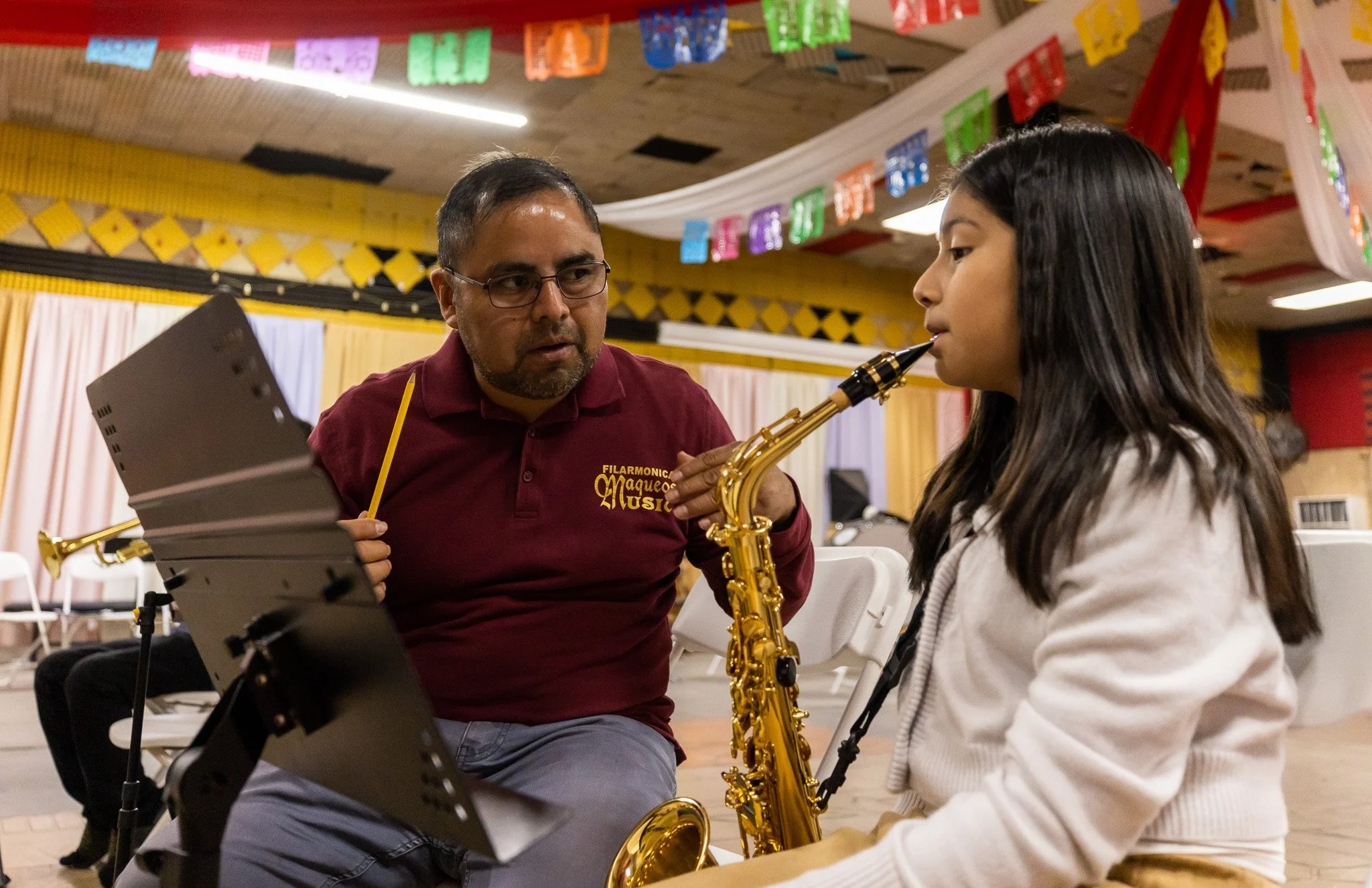 Director de Filarmónica Maqueos Music, Estanislao Maqueos, practica individualmente con su estudiante para el festejo de la Santa Cecilia en Korea Town.